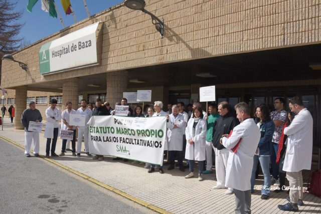 Concentración de médicos en el Hospital de Baza en protesta por el borrador de condiciones laborales del Ministerio de Sanidad y un Estatuto Marco propio. En la mañana de ayer, un numeroso grupo de médicos del Hospital de Baza se congregó a las puertas del centro sanitario para manifestar su rechazo al borrador de condiciones laborales elaborado por el Ministerio de Sanidad. La concentración, convocada por los facultativos de la provincia de Granada, responde a la falta de respuesta por parte de la Administración a sus reivindicaciones.