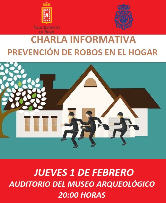 Baza acogerá, el próximo jueves, una charla informativa sobre seguridad en el hogar abierta y gratuita. La seguridad en el hogar y cómo protegerlo frente a los ladrones será el tema central de la charla informativa que ofrecerá la Policía Nacional en colaboración con el Ayuntamiento de Baza, el próximo 1 de febrero a las ocho de la tarde en el Auditorio del Museo Arqueológico de Baza.