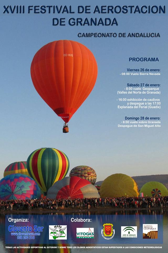 Del 26 al 28 de enero se celebrará el XVIII Festival de Aerostación de Granada y Campeonato de Andalucía, con una jornada en tierras del Geoparque del Cuaternario Valles del Norte de Granada. El Festival de Aerostación de Granada cumple su XVIII edición y cuenta con la previsión de asistencia es de unos 15 equipos de vuelo, que participarán en los diferentes actos programados para esta edición, que son los siguientes:
