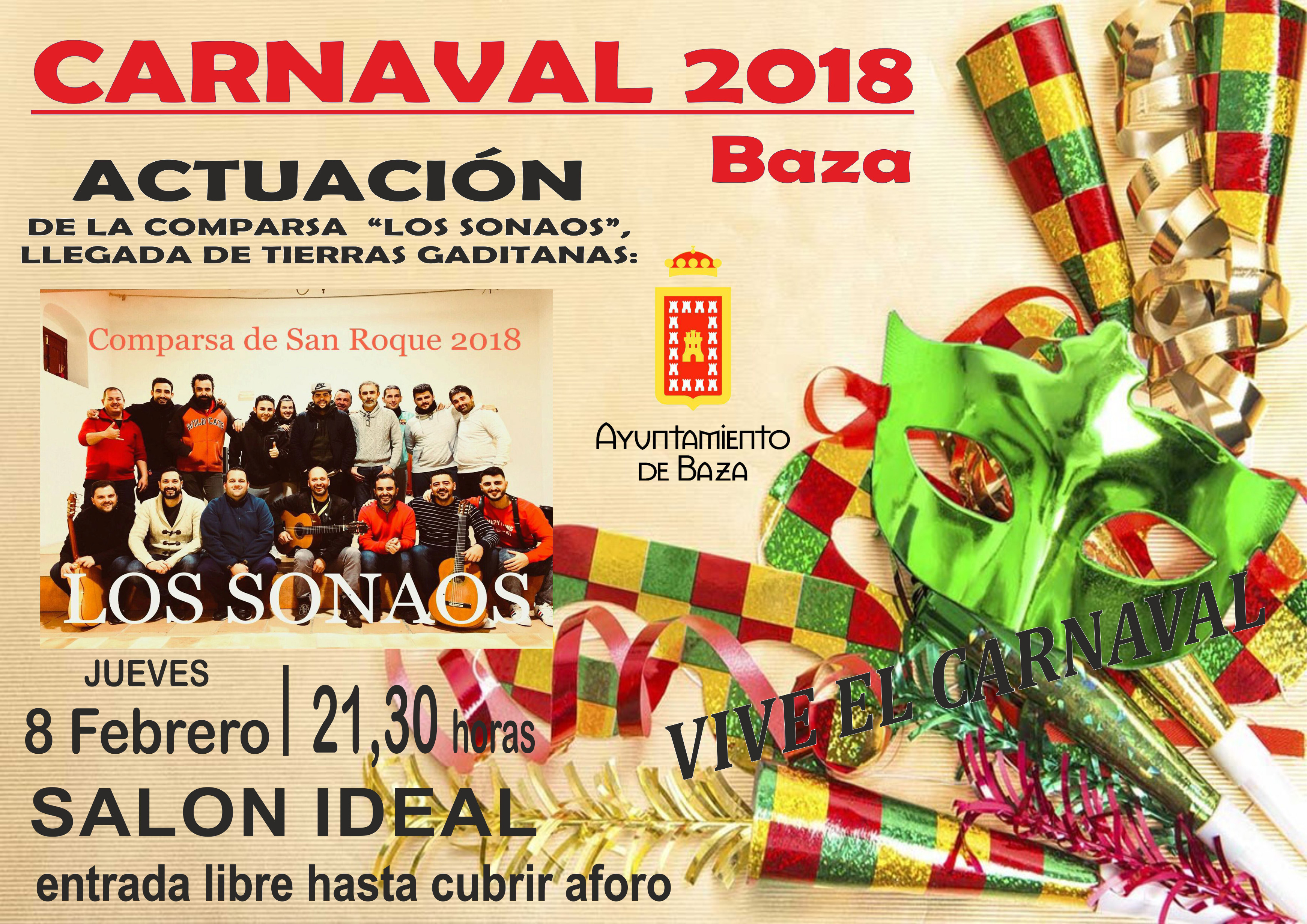 La comparsa gaditana Los Sonaos sonará en el Ideal dentro de los actos organizados para el Carnaval bastetano. Los Carnavales de 2018 traen hasta Baza los ritmos y letras gaditanas con la actuación de la comparsa ‘Los Sonaos’, que llegarán al escenario del Salón Ideal – Auditorio Enrique Pareja, el próximo 8 de febrero, a las nueve y media de la noche en una actuación para la que se contará con entrada gratuita hasta completar el aforo.