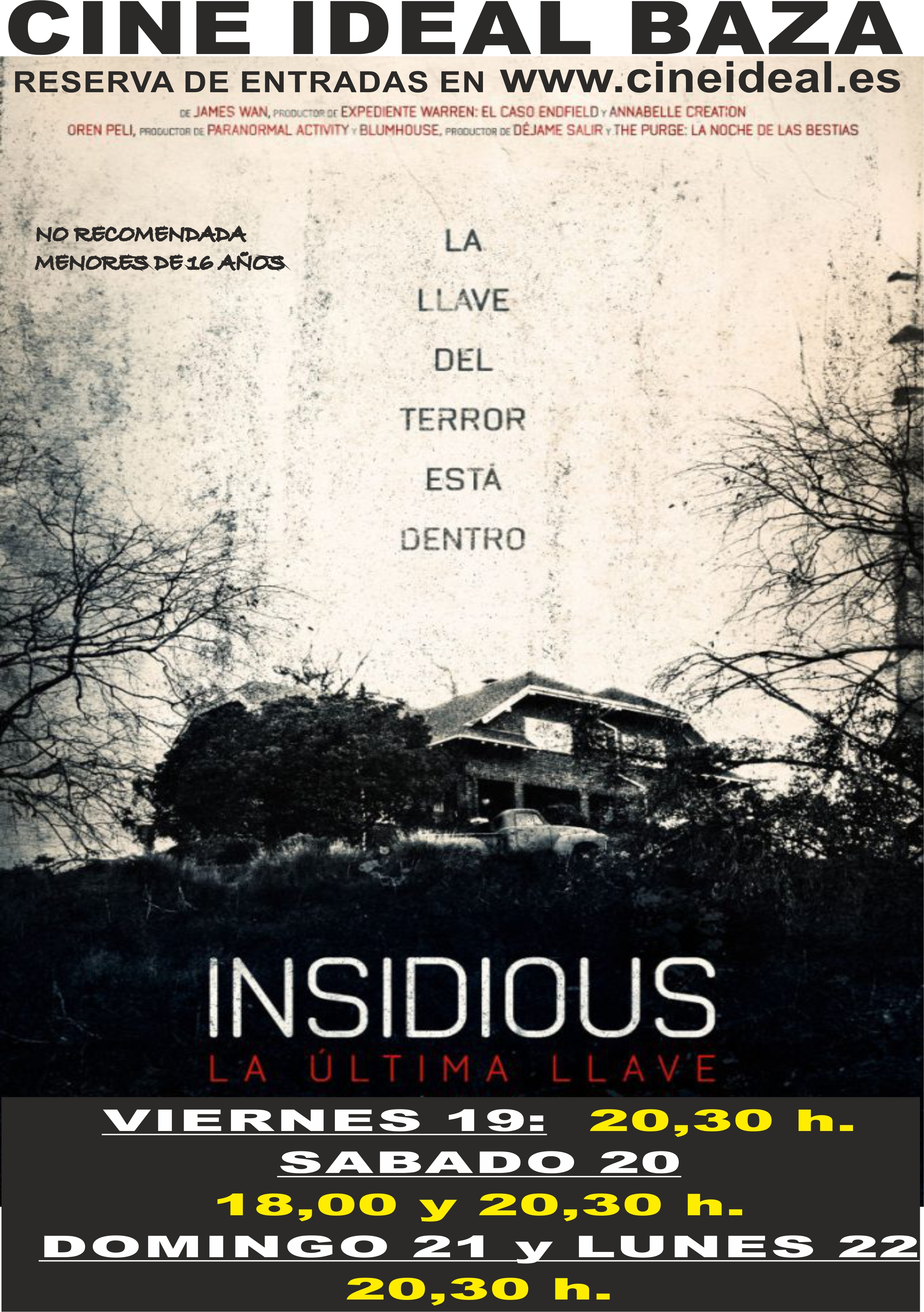 Cine de terror para este fin de semana en el Cine Ideal de Baza. Un fin de semana en el que llega a la pantalla del Cine Ideal la película “Insidious: La última llave”, que se proyectará el viernes 19 a las 20,30 horas, el sábado 20 a las 18,00 y 20,30 horas y el domingo 21 y lunes 22 en sesión única a las 20,30 horas
