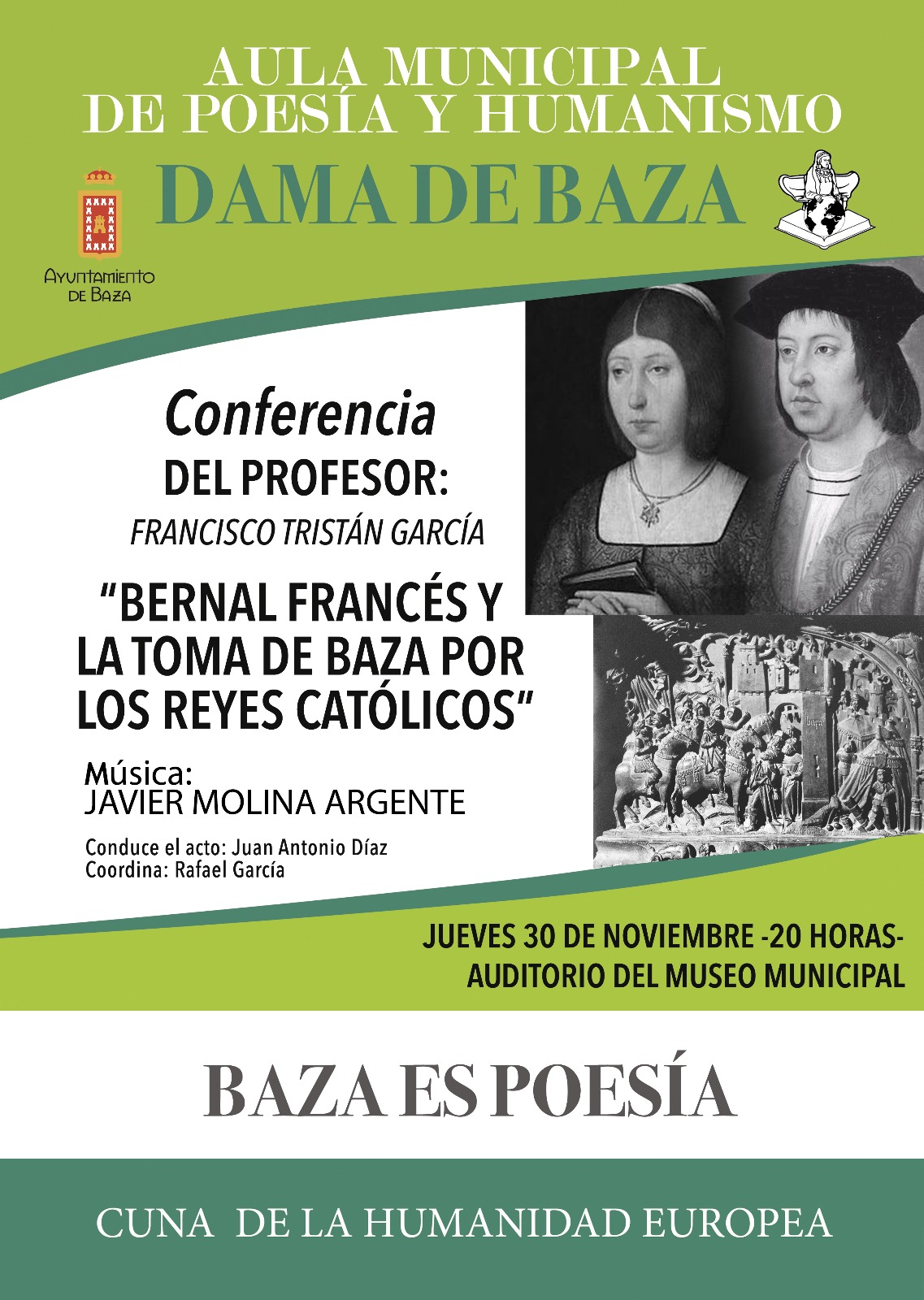 Para ello se contará con una participación de garantía, la del Profesor Francisco Tristán García, quien abordará una conferencia sobre un personaje de sumo interés, bajo el título de “Bernal Francés y la Toma de Baza por los Reyes Católicos”.