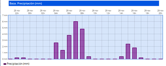 Buena jornada de lluvia la vivida ayer en nuestra ciudad con algo más de 24 litros recogidos en las últimas horas. Un total de 24,2 litros se recogían en Baza, repartidos a lo largo de toda la jornada. De las 22 a las 24 horas, apenas cayeron 0,4 litros, pero fue a partir de las cuatro de la mañana, cuando los registros oficiales hablan de las mayores cantidades, con un total de 19 litros, destacando que entre las seis y las nueve se recogieron casi quince litros. Las cifras oficiales de la Estación Meteorológica de Baza nos ofrecían también datos de lluvia desde las 14 a las 17 horas, momentos en los que se recogieron 4,8 litros más.