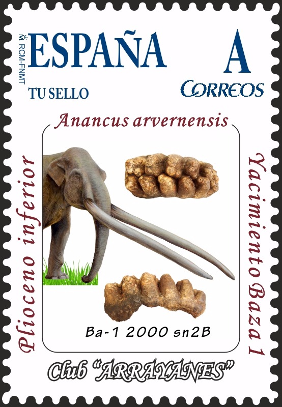 El mastodonte Anancus Arvernensis del Yacimiento Baza- 1 se hace Tu Sello en una edición limitada de 300 ejemplares. El mastodonte Anancus Arvernensis ha regresado a Baza tras casi 4,5 millones de años y ha sido en forma de edición limitada de sellos. Es decir, en el Tusello que la asociación filatélica Arrayanes dedica a este mamífero del que se han encontrado restos de molar en el yacimiento paleontológico Baza- 1 durante la presente campaña.