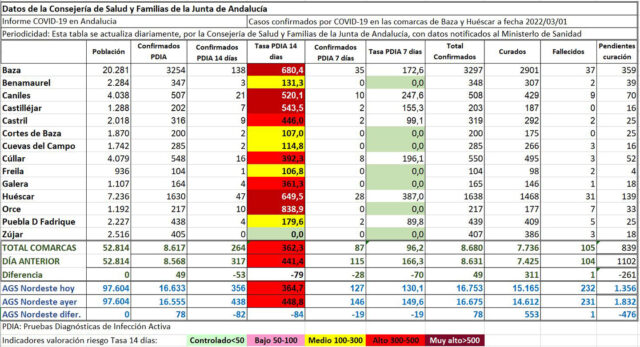 Aun así, desde el viernes 25 al lunes 1 de marzo, Baza y Huéscar volvían a encabezar el dato de los nuevos contagios, con 23 y 16, respectivamente, mientras que Caniles sumaba 3, Castilléjar y Cúllar añadían 2 y Castril sumaba otro caso más, mientras que el resto de municipios dejaban a cero ese crecimiento. Con estos datos, Castilléjar subía al nivel sanitario “Muy alto” y Galera mejoraba al pasar al nivel “Alto”.