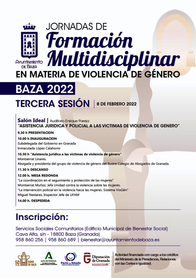 Abiertas inscripciones para la 3ª sesión del programa de Formación Multidisciplinar con “Asistencia jurídica y policial a las víctimas de violencia de género” del 8F. El próximo 8 de febrero tendrá lugar la tercera sesión de las Jornadas de Formación Multidisciplinar en Materia de Violencia de Género programadas por el Ayuntamiento de Baza desde el área de Igualdad, Bienestar Social y Mujer. En este caso la temática a abordar gira en torno a asistencia jurídica y policial a las víctimas de violencia de género. Para participar en ella, se puede formalizar ya la pertinente inscripción en Bienestar Social.