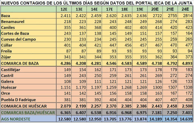 Y si nos referimos al ámbito local, los municipios que destacan en este lunes son los siguientes: Huéscar que ha sumado 36 nuevos contagios y sube su tasa a 14 días, mientras paradójicamente baja la de 7 días; Baza, que no se ha quedado corta con otros 32 contagios más; Galera con 7 contagios más y Zújar con otros 6 y suben su tasa a 14 días; Castril con 7 contagios más y La Puebla don Fadrique con otros 2, municipios que suben ambas tasas, mientras que en el resto de poblaciones, la bajada de tasas ha sido la línea común que se refleja en estos datos y los municipios con mejor comportamiento que han sido los de Castilléjar que no ha sumado ningún contagio, Cortes de Baza y Orce que han sumado uno y Caniles, Cuevas del Campo y Cúllar que han sumado dos contagios nuevos.