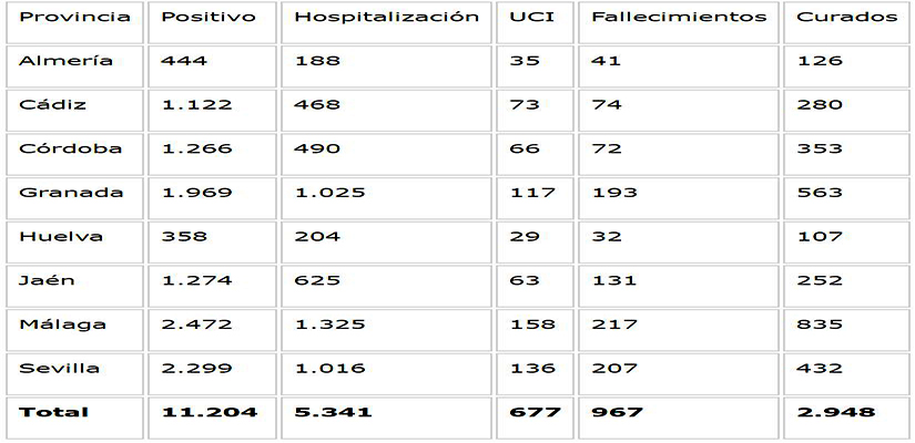 La Consejería de Salud y Familias informa que se han confirmado en Andalucía 151 nuevos casos de Coronavirus en las últimas horas. La Consejería de Salud y Familias informa que se han confirmado en Andalucía 151 nuevos casos de Coronavirus en las últimas horas, tras lo que el número total de afectados en Andalucía asciende a 11.204.
