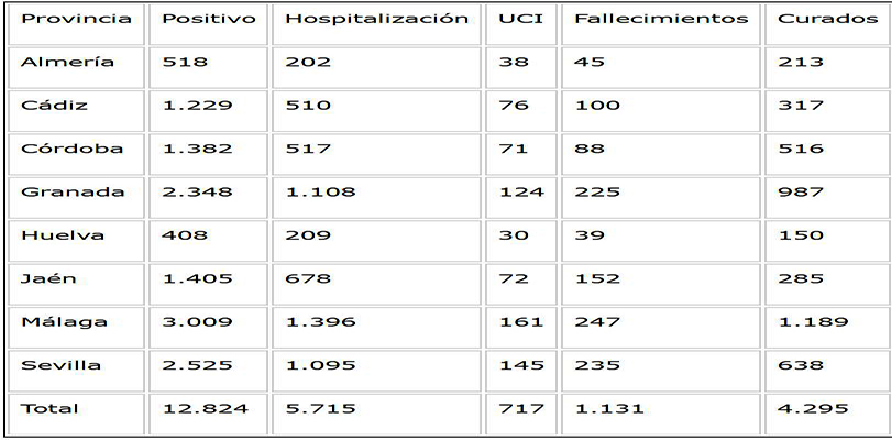 Datos estos sobre los que cada día tenemos más dificultades para su obtención y que ofrecen notables diferencias con los que facilita Consejería de Salud y Familias en colaboración con el Instituto de Estadística y Cartografía de Andalucía, referidos al 24 de abril, que son los siguientes: