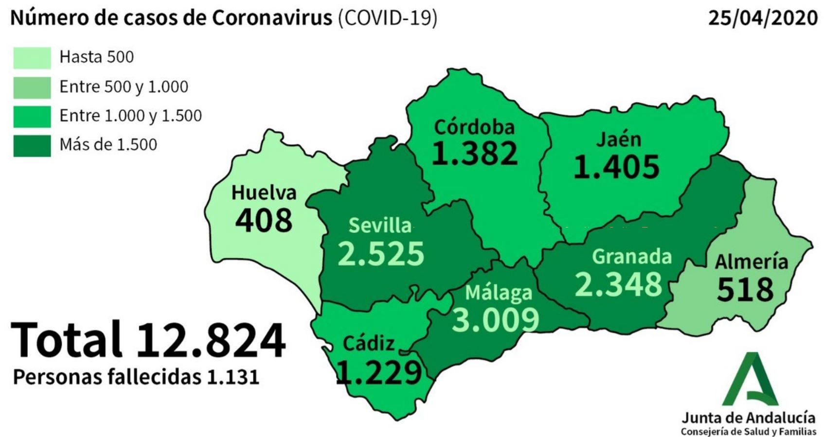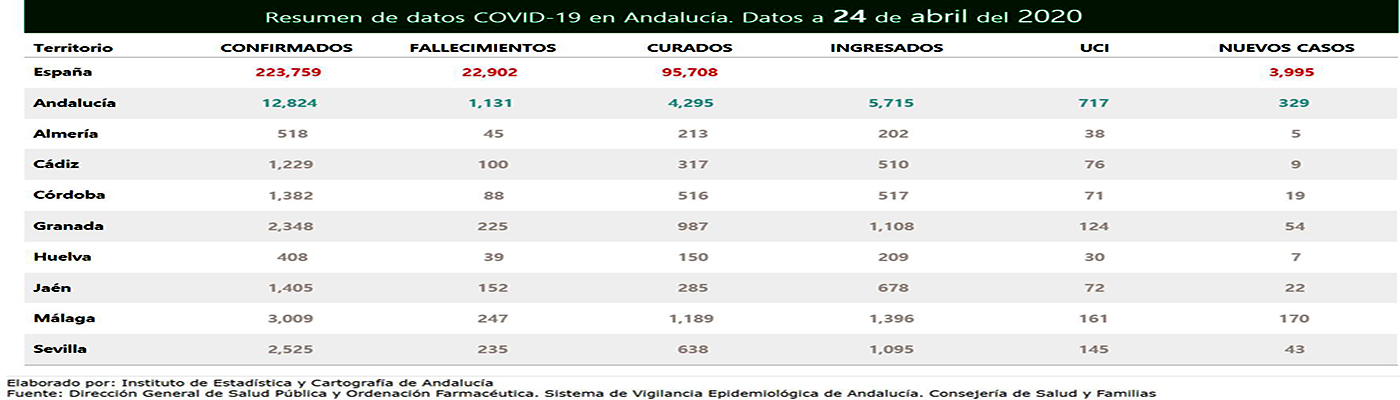 Datos estos sobre los que cada día tenemos más dificultades para su obtención y que ofrecen notables diferencias con los que facilita Consejería de Salud y Familias en colaboración con el Instituto de Estadística y Cartografía de Andalucía, referidos al 24 de abril, que son los siguientes: