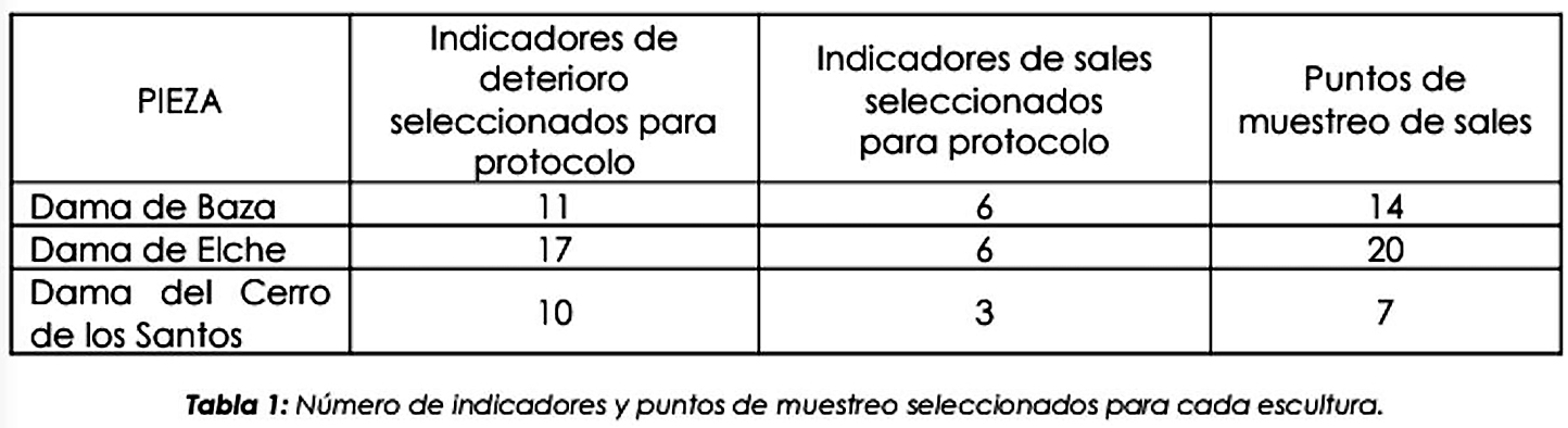 Los indicadores son registros del estado físico de un deterioro, con el fin de evaluar la evolución de una patología o lesión. A partir de ahora, y gracias a la metodología implantada, cualquier cambio producido en esos indicadores establecidos (tabla 1) podrá ser medido y registrado objetivamente, incluso aquellos que son imperceptibles en la visión directa (Anexos 1.2, 2.2, 3.2, 1.10, 2.9 y 3.9). Para cada una de las esculturas se marcaron unos indicadores concretos de deterioro (tabla 2), unos determinados puntos de muestreo de salinidad (tabla 3) y, a partir, de los resultados obtenidos mediante conductivimetría, los puntos con mayor contenido salino (> 500 µS/cm), seleccionados para el protocolo de seguimiento y control de sales. La selección de puntos de muestreo de sales se realizó evitando, de acuerdo a los principios de conservación, zonas con policromía, recubrimientos ligados a intervenciones anteriores, zonas de talla delicada y zonas con elevada descohesión.