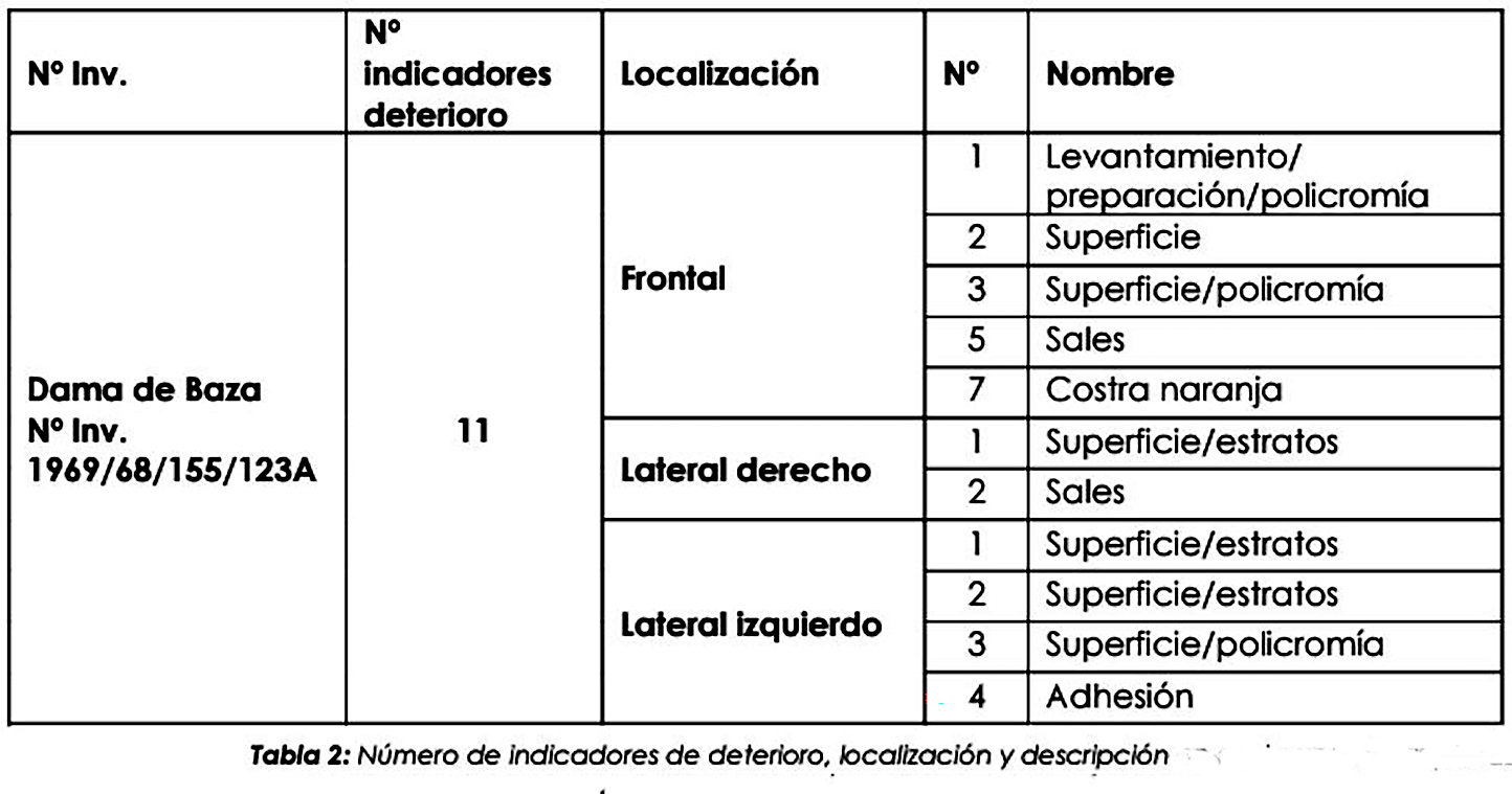 Para la Dama de Baza se han determinado 11 puntos representativos de un deterioro y 14 puntos de muestreo de sales solubles de los cuales se han seleccionado 6 puntos para el protocolo de seguimiento y control de sales.