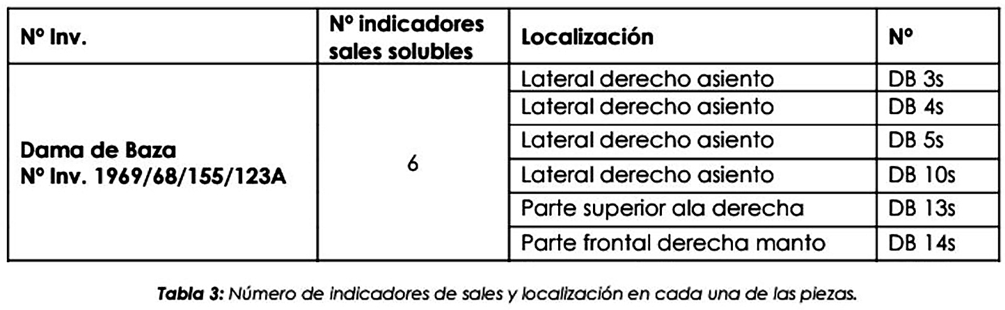 Los estudios previos realizados en los períodos de 1971-1972 y 2007-2008 sobre la Dama de Baza, incidían en el alto contenido salino de la escultura. En todas las muestras analizadas por los distintos investigadores se localizaron sales sulfatadas: en el caso del yeso, relacionadas con la capa de preparación, y el resto de sales vinculadas con el ascenso capilar durante la etapa de enterramiento arqueológico. Las sales sulfatadas identificadas fueron: sulfato cálcico dihidratado (yeso), sulfato potásico-cálcico (singenita) como sal principal, sulfato magnésico (starkeyita y pentahidrita) y sulfato potásico-magnésico (leonita).