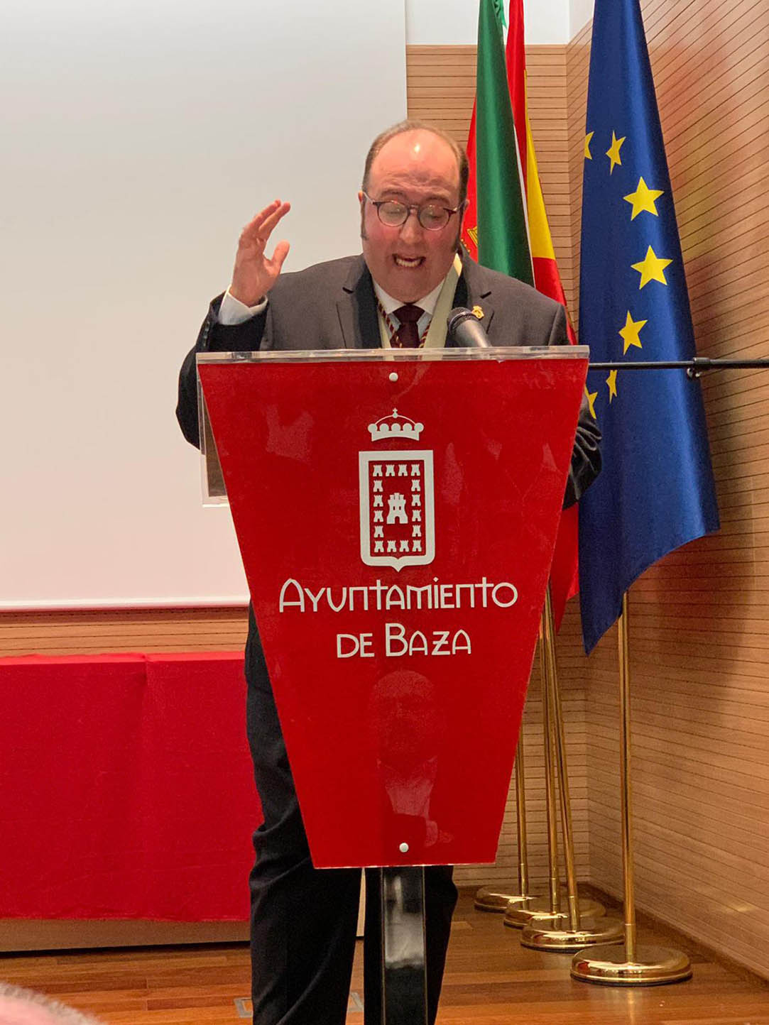 Gracias y mil veces gracias a la Federación de Cofradías de Baza, en especial a su Sra. Presidenta, querida Carmen: ¡qué alegría tan grande! que me produce el hecho de poder escribir por vez primera el nombre de Presidenta, sí, en femenino, porque ya era hora que la mujer presidiera esta institución cofrade ocupando así el puesto que le corresponde en nuestra Semana Mayor, es decir, el más importante de todos y, por lo tanto, el de mayor responsabilidad. Mi apreciada Carmen, mi buena amiga, estoy absolutamente convencido que tu mandato dejará huella lo mismo que ya has hecho historia como ya lo hiciste siendo la Hermana Mayor de tu hermandad, la de Nuestro querido Nazareno. Millones de gracias también a todos mis amigos y amigas que conformáis su Junta Permanente compuesta por grandes cofrades, nombres propios que dan apellidos a la Semana Santa Bastetana, y mejores personas aún: Ángel José Martínez Bocanegra, Teresa Esmeralda Castellano Velázquez de Castro, Carmen Fernández Pérez, Paco Manzaneda Soto, Carmen Eva Mateos Martínez y Miguel Rodríguez Leonés, qué gran Junta de Gobierno para la Federación, ¡qué suerte! tiene la Presidenta al poder contar con semejante cuadrilla bajo el paso que procesiona a la Semana Santa de Baza, y a todo su Plenario tornándose éste en su acolitado para que el paso salga a la calle.