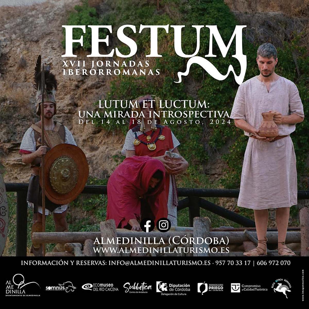 Las fiestas iberorromanas de Almedinilla abarcan desde 14 al 18 de agosto, con una amplia y variada programación: conferencias, talleres, actividades de gastronomía íbera, recreaciones de rituales, visitas guiadas…, además de poder visitar el museo arqueológico y el Cardo o mercado.