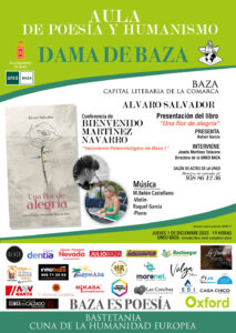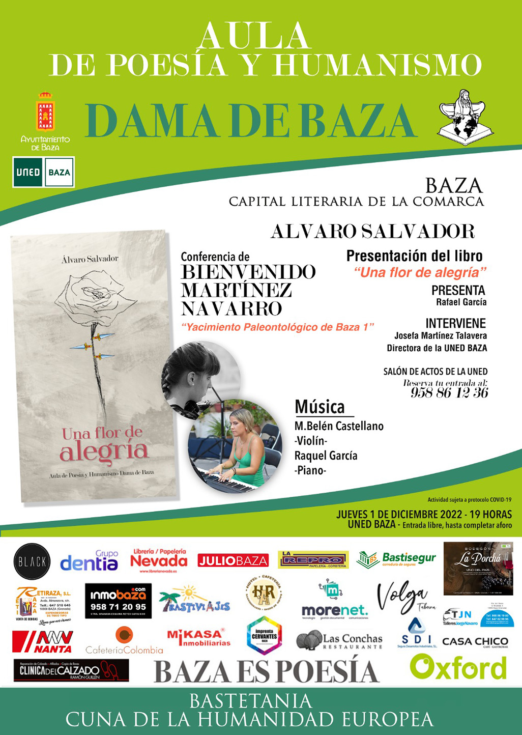 El Aula de Poesía ofrece este jueves 1 de diciembre una conferencia de Bienvenido Martínez sobre el yacimiento Baza 1 y la presentación de un libro de Álvaro Salvador. El Aula de Poesía y Humanismo ‘Dama de Baza’ propone para este jueves, 1 de diciembre, una completa tarde de cultura en la que paleontología, literatura y música se dan la mano.