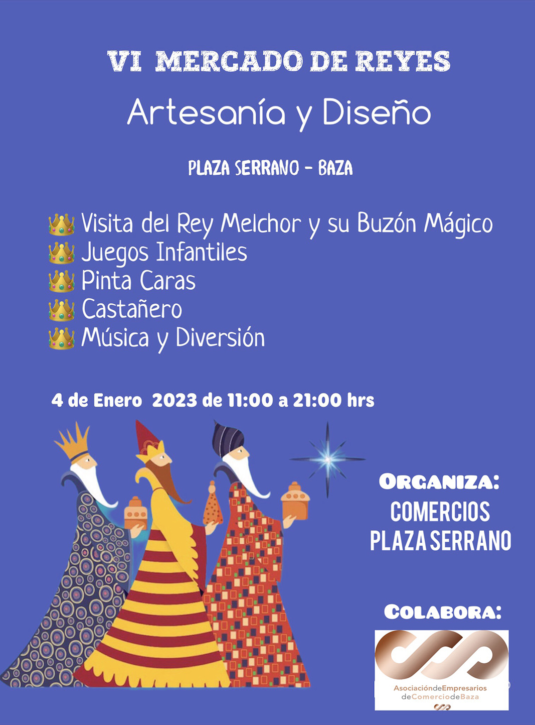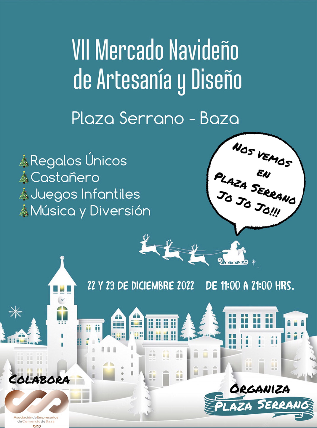 Como ya es tradición, en la Plaza Serrano se podrá disfrutar del VII Mercado Navideño de Artesanía y Diseño, con juegos infantiles, música, castañero…, los días 22 y 23 de diciembre, de 11:00 a 21:00 horas. El día 4 de enero se realizará el Mercado de Reyes con la presencia del Rey Melchor y habrá juegos, pintacaras y castañero en esta misma plaza.