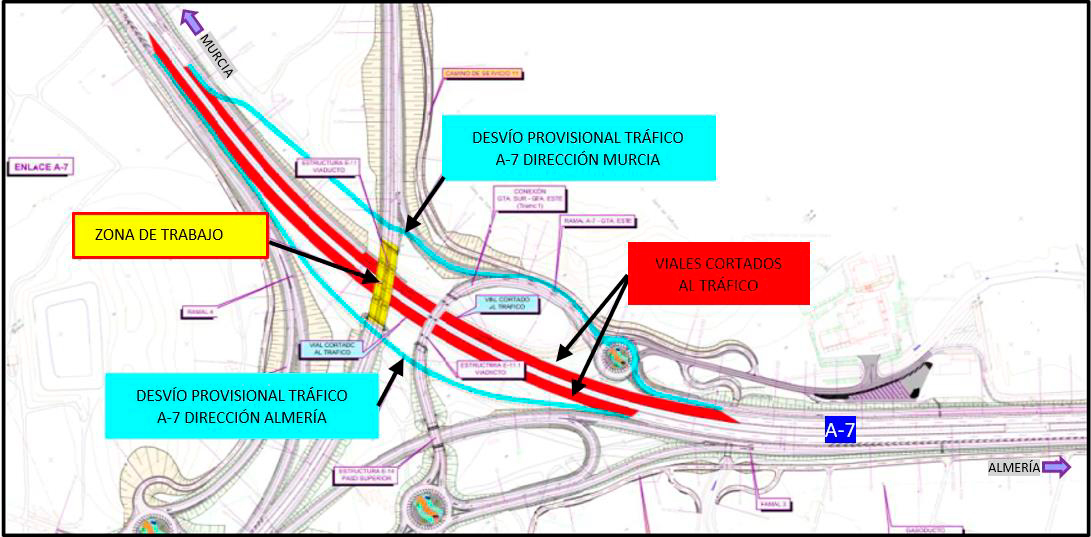 Como consecuencia de dichas operaciones, entre las 7:30 y las 19:30 de hoy jueves se cortará el tronco de la autovía A-7, y por consiguiente el tráfico que circula por ella, para lo que se habilitarán desvíos alternativos de un carril por sentido, por los ramales del enlace, que estarán debidamente señalizados en el emplazamiento.