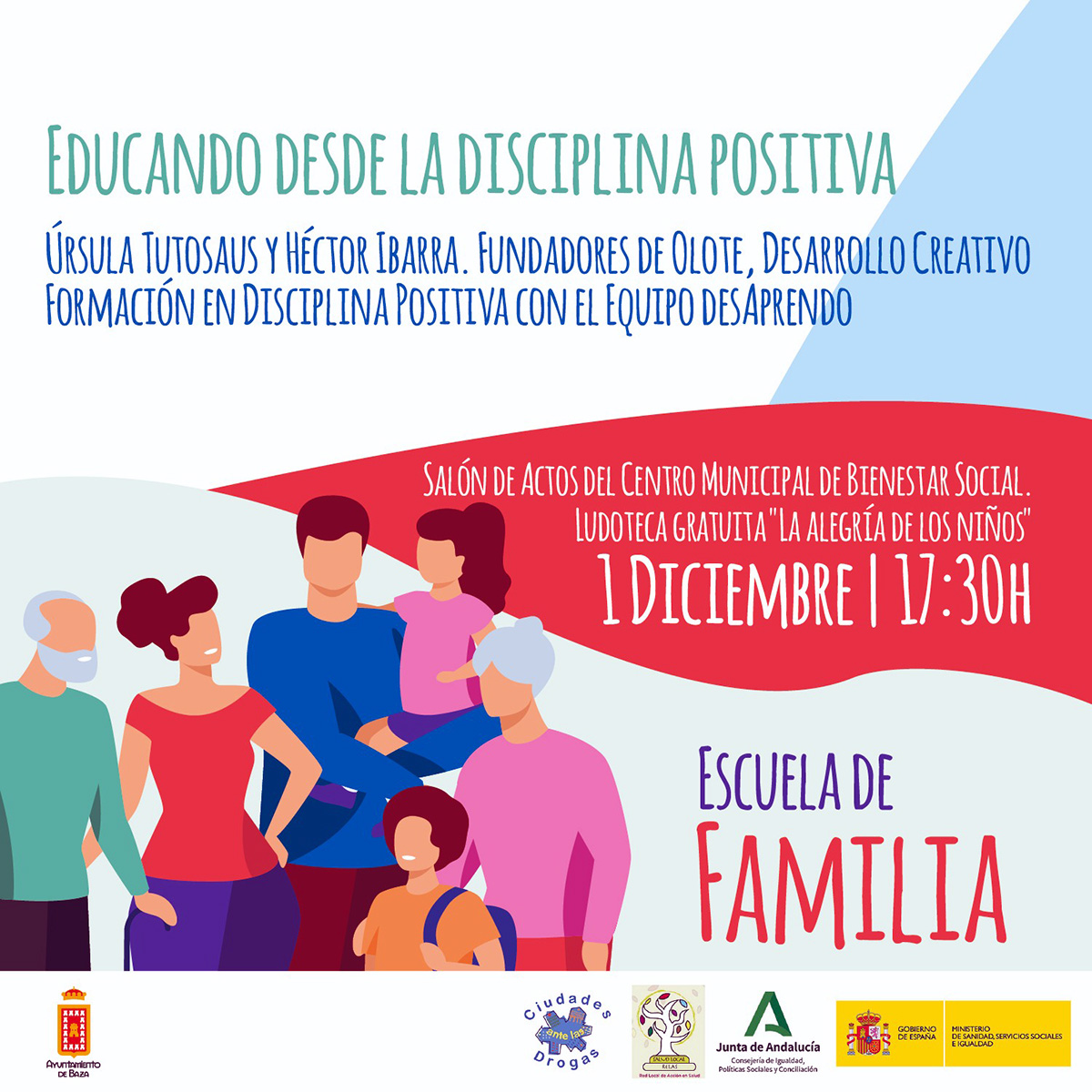 La nueva sesión de la Escuela Municipal de Familia ofrecerá claves para educar desde la disciplina positiva. La Escuela Municipal de Familia que organiza el Ayuntamiento de Baza a través del área de Bienestar Social, Igualdad, Mujer, Salud, Deporte y Juventud continúa su actividad este jueves 1 de diciembre, con una sesión en la que Úrsula Tutosaus y Héctor Ibarra, fundadores de “Olote, desarrollo creativo”, darán claves de formación en disciplina positiva con el equipo “Desaprendo”.