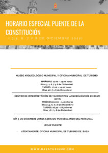 Centro de Interpretación de los Yacimientos Arqueológicos de Basti (CIYA): las mañanas de 10 a 14 h., los días 3, 4, 6, 7 y 8 de diciembre y por las tardes, de 16.30 a 18.30 h., los días 3, 6, 7 y 8 de diciembre.