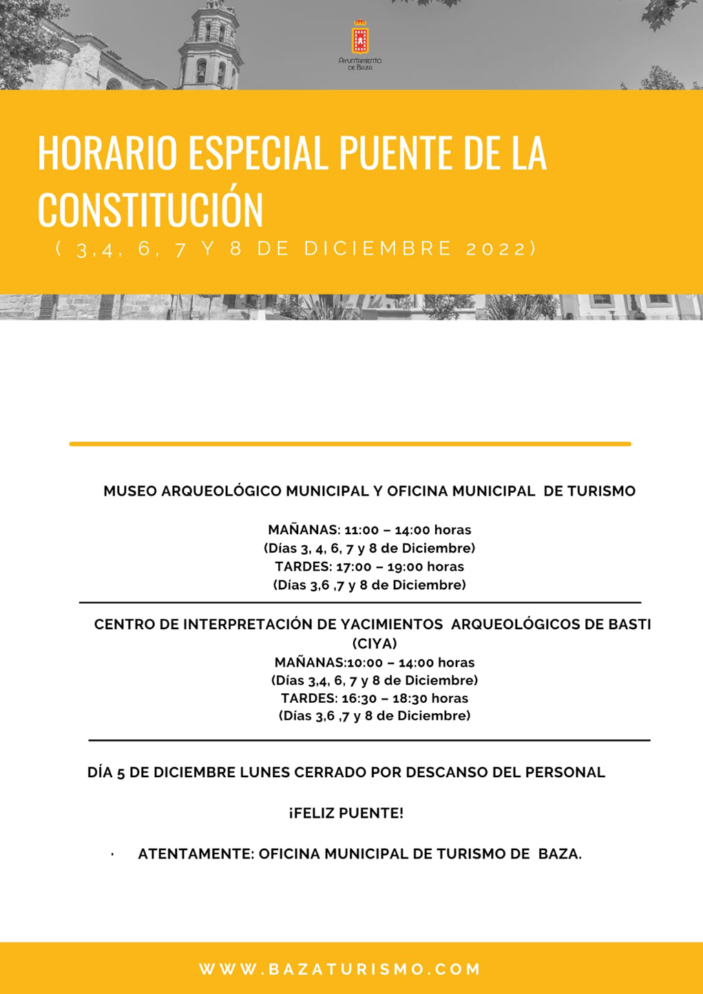 Horarios especiales en las dependencias turísticas de Baza durante el puente de diciembre. Días en los que se suele producir siempre un mayor movimiento de visitantes y viajeros que llegan a nuestra ciudad, lo que ha motivado los cambios de horario que se indican a continuación: