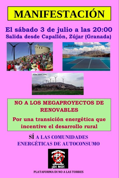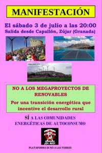Una cita fijada para el sábado 3 de julio de 2021, con salida a las 20:00 horas desde Capallón, en Zújar, y en base a “Que ante la avalancha de proyectos de renovables, que se intentan implantar en la zona del Altiplano de Granada, también estos, a nivel provincial, regional y nacional, unidos también a las expropiaciones forzosas que se pretender llevar a cabo; Queremos trasladar que en ésta mañana de manifestación, diversos grupos, asociaciones, entidades, ayuntamientos, plataformas, habitantes del lugar, y otras entidades y personas, procedentes de diversos lugares, daremos voz para decir #RenovablesSiperoNoAsi”