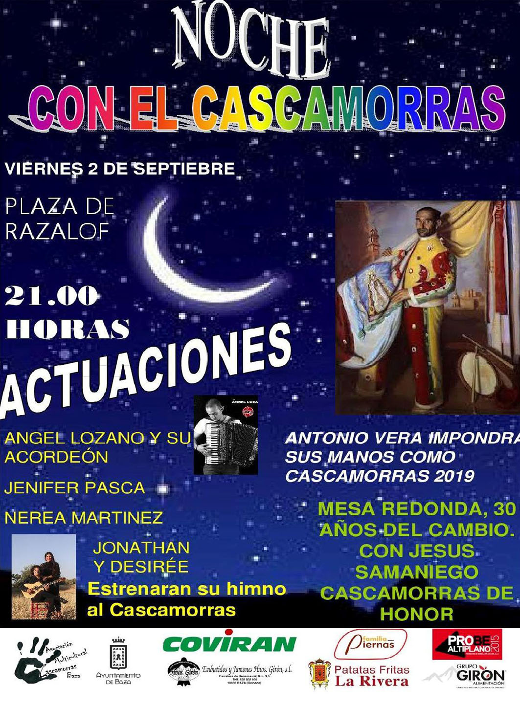 Finalizado este acto, dará inicio una velada musical en la que, en primer lugar, se estrenará el Himno al Cascamorras que han compuesto dos jóvenes bastetanos, Jonathan y Desirée, que están llevando a cabo una carrera espectacular, a pesar de su juventud, y cosechan el éxito en todas y cada una de sus actuaciones. Después será Ángel y su acordeón, acompañado de Jenifer Pasca y Nerea Martínez.
