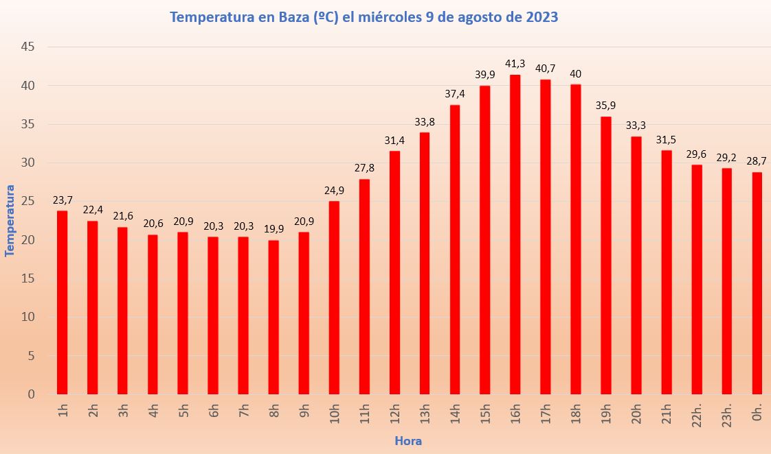 La temperatura máxima de 41,6 grados se producía poco después de las cuatro de la tarde, mientras que la mínima de 19,4 se producía poco antes de las ocho de la mañana y tras transcurrir el periodo nocturno con temperaturas superiores a los veinte grados.