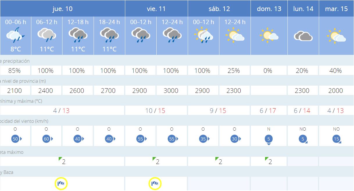 Completemos la información meteorológica diciendo que las temperaturas serán moderadas, con mínimas que se moverán hasta el próximo martes entre los 4 y los 6 grados, excepto el viernes y el sábado que estarán entre los 9 y 10 grados. En cuanto a las máximas, tendrán valores moderados para esta época del año, con una horquilla hasta el martes de entre los 13 y 15 grados, con la excepción del domingo 13 en el que podría alcanzar los 17º C.