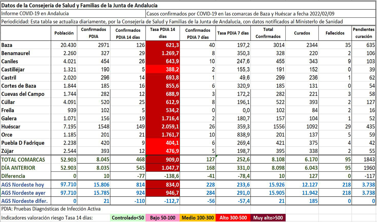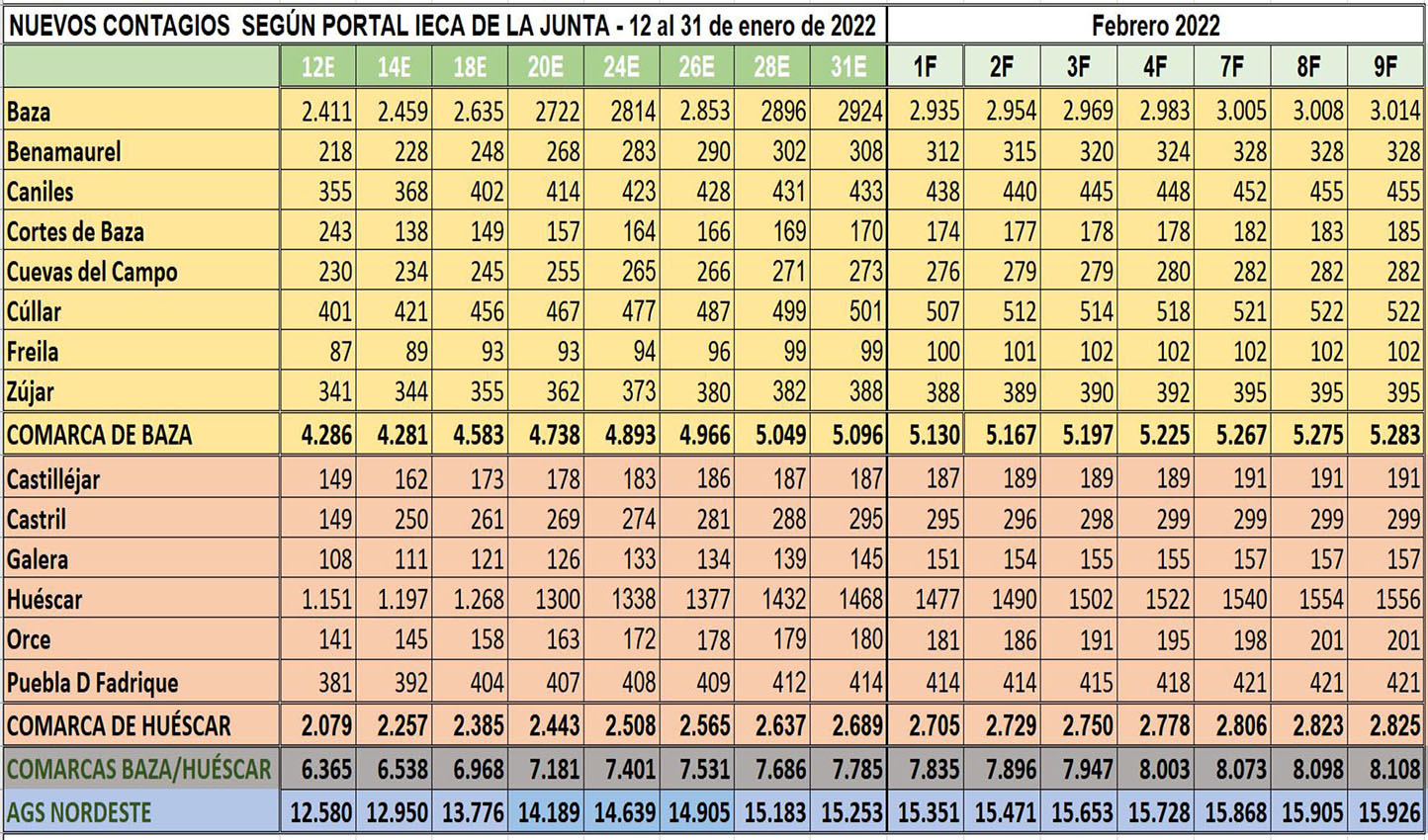 Para terminar, dejar constancia de las notificaciones efectuadas desde la propia AGS Nordeste, donde informan de 7 pacientes ingresados en el Hospital de Baza y de 15 profesionales con baja Covid, ambos a día de ayer, mientras que referidos los siguientes datos al martes 8 de febrero, decir que se notificaron 16 test y 34 PCR positivas, mientras que se administraron otras 648 vacunas.
