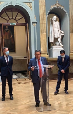 José Entrena estuvo acompañado por el presidente de la Diputación de Badajoz, Miguel Ángel Gallardo, y por el portavoz del Grupo Socialista en el Senado, Ander Gil, con quienes previamente había mantenido una reunión de trabajo sobre la iniciativa presentada en la Cámara Alta por el grupo Parlamentario Socialista, para la puesta en marcha de un plan contra la exclusión financiera en la España rural.