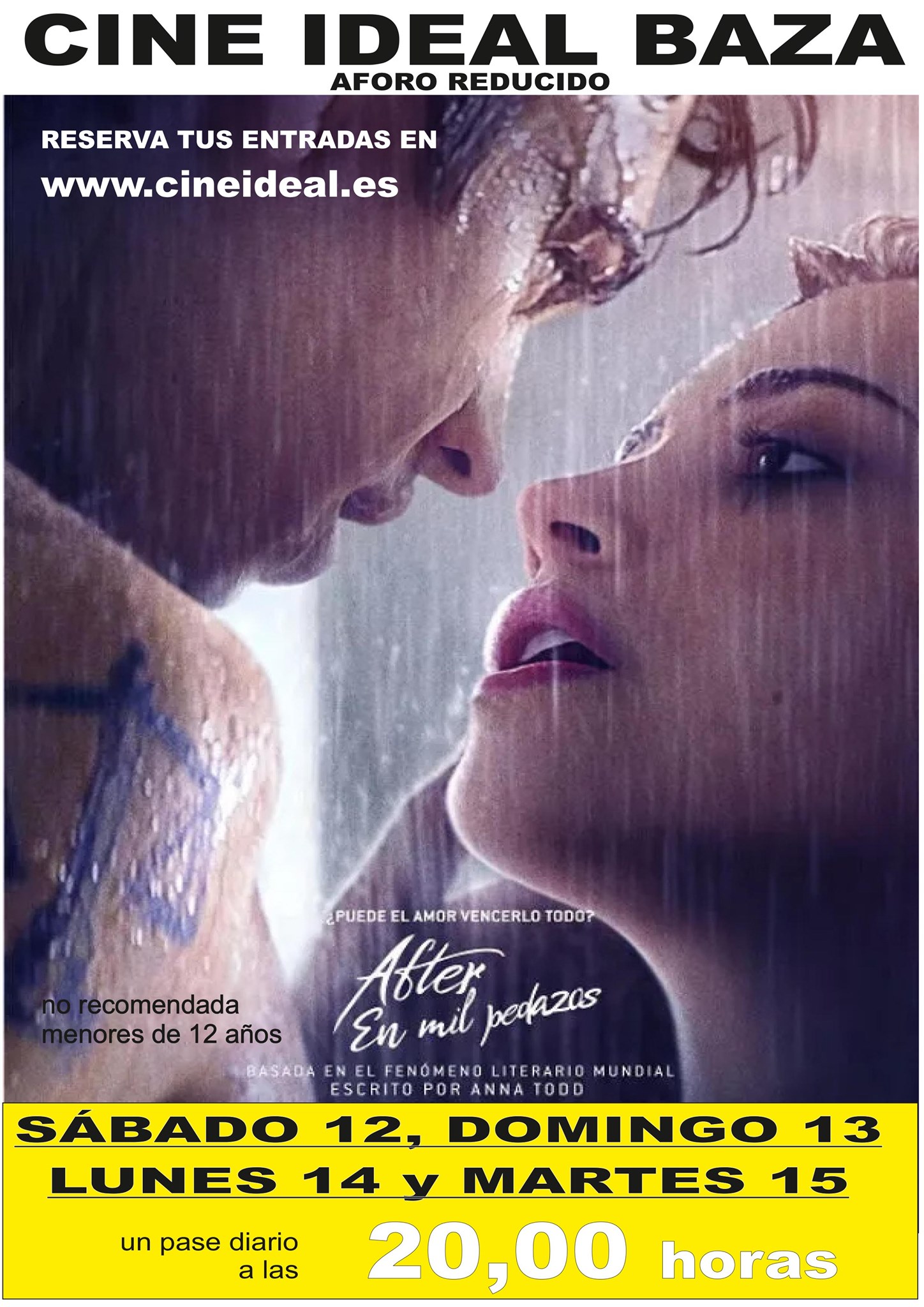 Cine Juvenil para este fin de semana en Cine Ideal Baza, con la proyección de la película “After, en mil pedazos”. Una película estadounidense de 90 minutos de duración, estrenada el pasado día 4 y dirigida por Roger Kumble como una producción dramática interpretada por Dylan Sprouse, Hero Fiennes Tiffin, Inanna Sarkis, Josephine Langford, Samuel Larsen, Shane Paul Mcghie