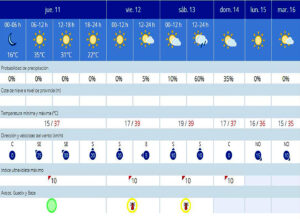 Junto a eso, dos noticias más esperanzadoras. La primera, la referencia que hace esta previsión a la lluvia, concediendo hasta un 60% de probabilidades a la posible presencia de agua en la zona, algo que no se ve desde el pasado mes de junio. La otra, el mantenimiento de las mínimas en valores que oscilarán entre los 15 y los 17 grados, excepto el sábado, que alcanzará un par de grados más.