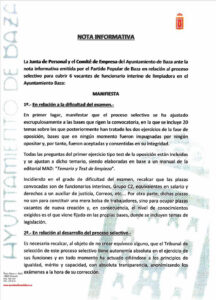 “Intolerable en opinión del Partido Popular que se celebren unas oposiciones en los primeros días de agosto y que los propios opositores se consideren “estafados” ante lo que debiera de ser una oportunidad para estabilizar su empleo en el Ayuntamiento de Baza. Consideran que se han producido graves irregularidades que para nada han garantizado la celebración de un proceso selectivo con transparencia, en igualdad de condiciones y garantizando el mérito y la capacidad de los opositores. Opositores que no descartan todo tipo de “medidas” ante lo que consideran un atropello del rodillo socialista en el Ayuntamiento de Baza.