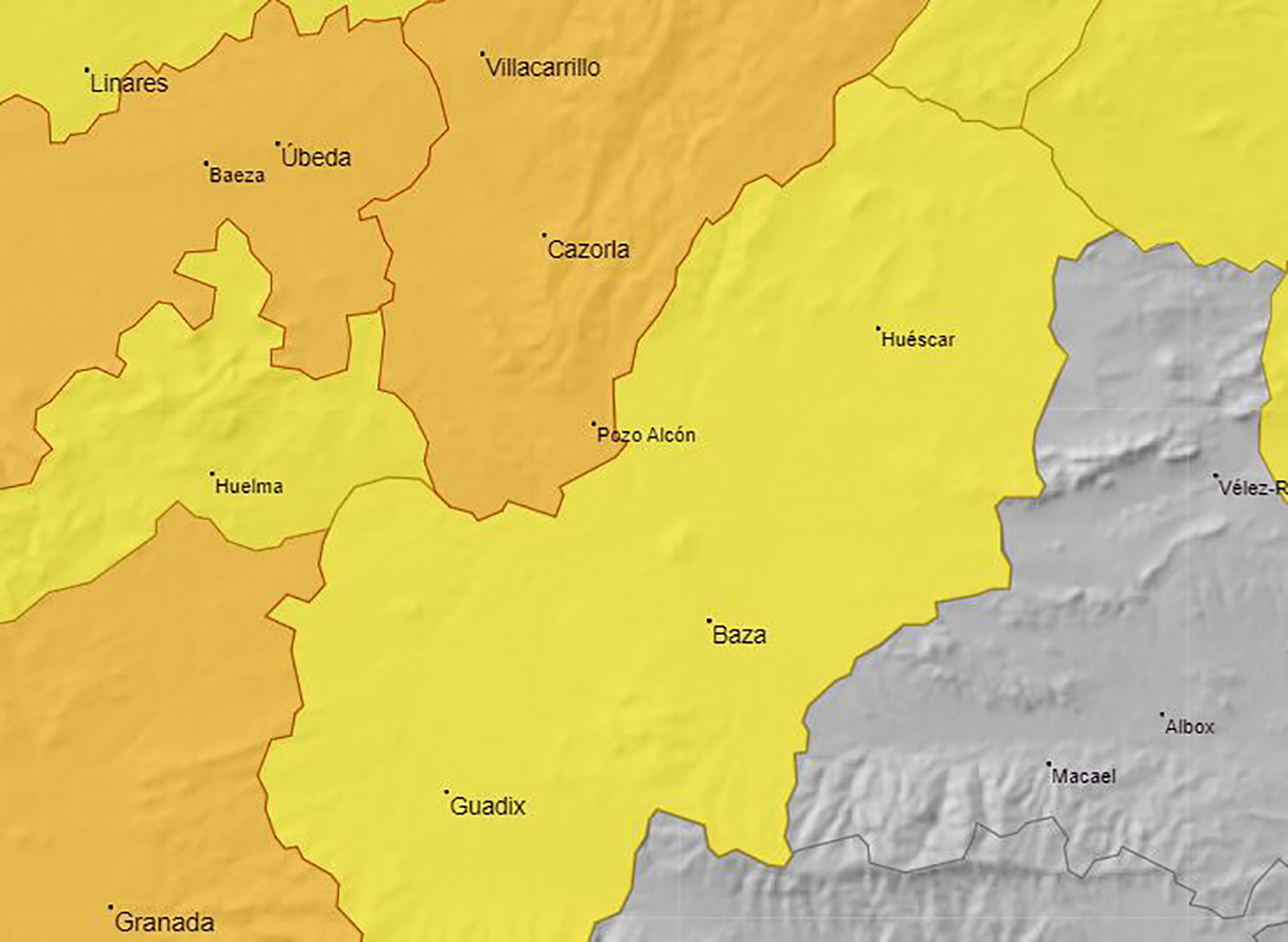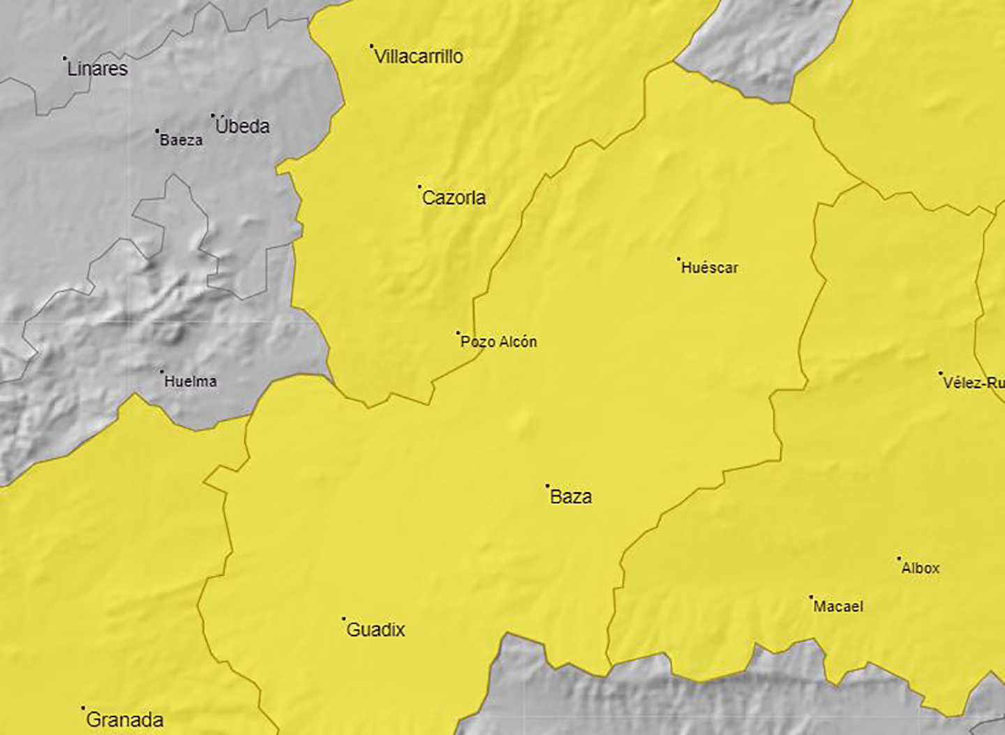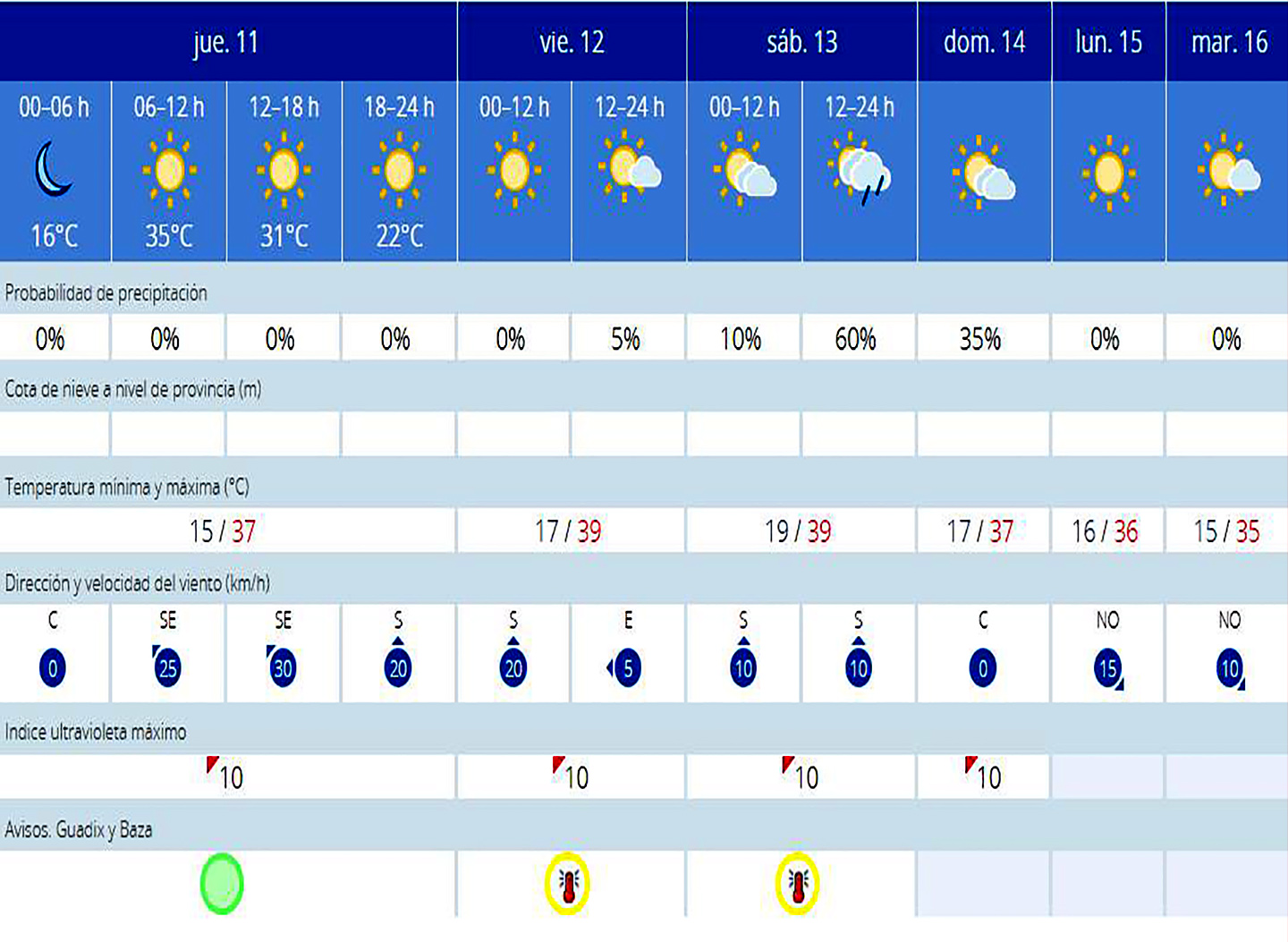 Nuevas alertas por altas temperaturas decretadas por AEMET para las jornadas del viernes y sábado próximos y 60% de probabilidades de lluvia para este último día. Una semana más, volveremos a recibir nuevas jornadas de temperaturas elevadas que, en esta ocasión nos esperan para el viernes y sábado próximos, cuando el termómetro vuelva a superar los 39 grados centígrados, lo que ha motivado sendas alertas de nivel amarillo decretadas por AEMET y referidas a las comarcas de Baza, Guadix y Huéscar, donde la franja horaria de las 13 a las 20 horas será la de calor más acuciante.