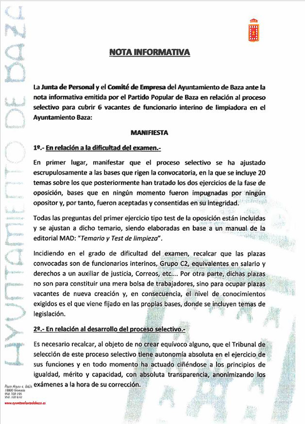 La Junta de Personal y el Comité de Empresa del Ayuntamiento de Baza ante la nota informativa emitida por el Partido Popular de Baza en relación al proceso selectivo para cubrir 6 vacantes de funcionario interino de limpiadora en el Ayuntamiento Baza: