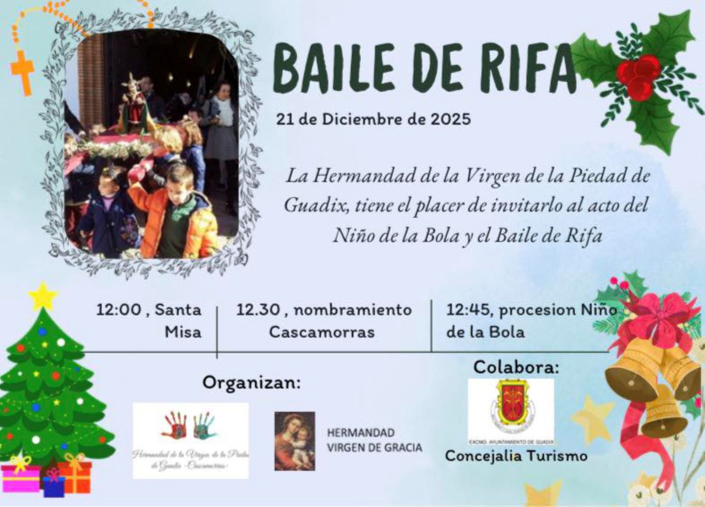 Tras la procesión, se celebrará el Baile de Rifa, en el que se sortearán distintos obsequios y productos tradicionales, aves de corral incluidas. Este acto, que mantiene vivas costumbres de larga trayectoria en Guadix, permitirá a los asistentes disfrutar de un momento de convivencia animado por la música y el ambiente navideño.