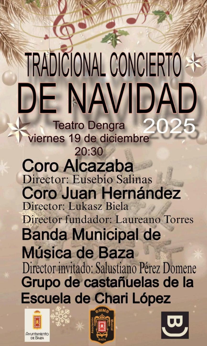Baza celebrará su Tradicional Concierto de Navidad el viernes 19 de diciembre en el Teatro Dengra. El Teatro Dengra de Baza volverá a llenarse de ambiente navideño el próximo viernes 19 de diciembre de 2025, cuando a las 20:30 horas se celebre el Tradicional Concierto de Navidad, una cita cultural ya consolidada en el calendario musical bastetano y muy esperada por los amantes de este tipo de eventos. El concierto, organizado con la colaboración del Ayuntamiento de Baza y la Banda Municipal de Música, reunirá sobre el escenario a varias formaciones locales que ofrecerán un programa variado y especialmente preparado para estas fechas.