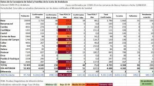 También disminuyeron los contagios a 7 días, con 5 afectados menos, a pesar de los 10 casos confirmados, mientras los curados se quedaban en 8, de los que 6 pertenecían a Francia y, de los otros dos, uno a Benamaurel y otro a Huéscar. Destacaron los descensos de la tasa a 7 días de Caniles, Cuevas del Campo y Freila, con 151,4, 228,7 y 319,5, lo que augura que pronto repercutirás en sus tasas de 14 días de duración.