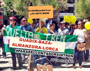 La Asociación Amigos del Ferrocarril Comarca de Baza y la Plataforma Comarca de Guadix por el Tren lideran al grupo de colectivos que han puesto en marcha la campaña «Parar el contador sin tren», en unos momentos en los que se cumplen 13.000 días desde el cierre de la antigua línea férrea Guadix Baza Almanzora Lorca. Junto a los mencionados, forman parte de esta iniciativa colectivos ferroviarios (Granada por el tren, Federación Andaluza de Asociaciones de Amigos del Ferrocarril FAAAF, Plataforma Tren Rural Andalucía, Mujeres al tren, Plataforma Almeriense por el ferrocarril, Marea Amarilla, Plataforma en defensa del ferrocarril de Murcia, Poniente de Granada por el tren, Plataforma por el ferrocarril de Teruel, Movimiento por el tren Ruta de la Plata, Amics del ferrocarril Illes Balears, Asociación El Labradorcico de Águilas) y colectivos de la Revuelta de la España Vaciada (Teruel Existe (con el diputado Tomás Guitarte a la cabeza), Soria Ya o Asociaciones Vecinales de Teruel).