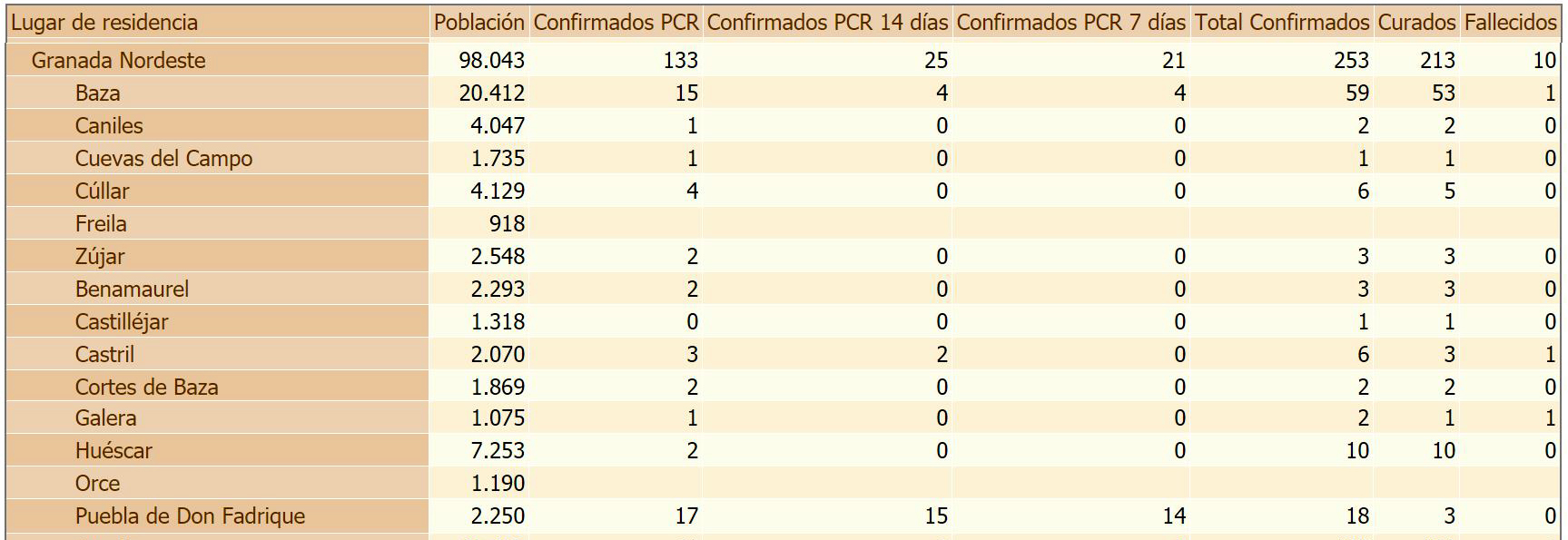 A nivel de las comarcas de Baza y Huéscar, y con datos de la Consejería de Salud de la Junta de Andalucía, en los últimos 7 días se han sumado los 4 confirmados por PCR en Baza y los 14 de Puebla de don Fadrique que, junto a 2 más en Guadix y 1 en Dólar, suman el total de 21 casos que se han registrado en el Área Sanitara Granada Nordeste.