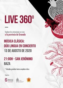El Dúo Lingua actúa en el Espacio Expositivo San Jerónimo el próximo 13 de agosto, a las 21 horas. La música de cámara del Dúo Lingua llenará el Espacio Expositivo San Jerónimo el próximo 13 de agosto y gracias al programa cultural ‘Live 360º’ de la Diputación de Granada, que ofrece espectáculos culturales de calidad en la provincia granadina.