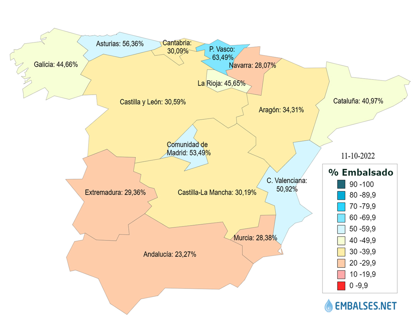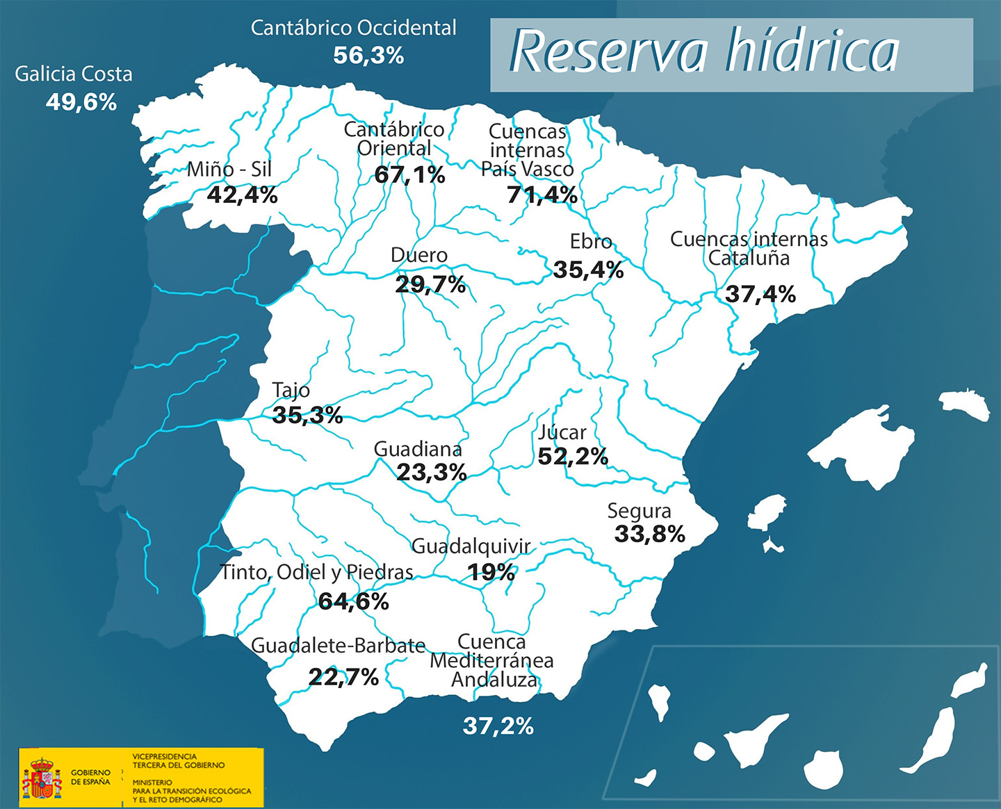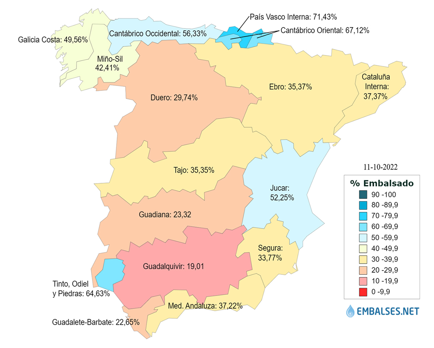 En cuanto a la situación por ámbitos, con datos del pasado martes, superan el 60% las Cuencas internas del País Vasco que están al 71,4%, la del Cantábrico Oriental que se encuentra al 67,1% y la del Tinto, Odiel y Piedras al 64,6%. Entre el30 y el 60%, están la Cuenca del Cantábrico Occidental al 56,3 %, la del Júcar al 52,2%, la de Galicia Costa al 49,6%, la del Miño-Sil al 42,4%, las Cuencas internas de Cataluña al 37,4%, la Cuenca Mediterránea Andaluza al 37,2% , la del Ebro al 35,4%, la del Tajo al 35,3% y la del Segura al 33,8%. Finalmente, por debajo del 30% están las cuencas del Duero al 29,7%, la del Guadiana al 23,3%, la del Guadalete-Barbate al 22,7% y, una semana más, con menor porcentaje de agua embalsada que ninguna otra, la del Guadalquivir al 19,01%.