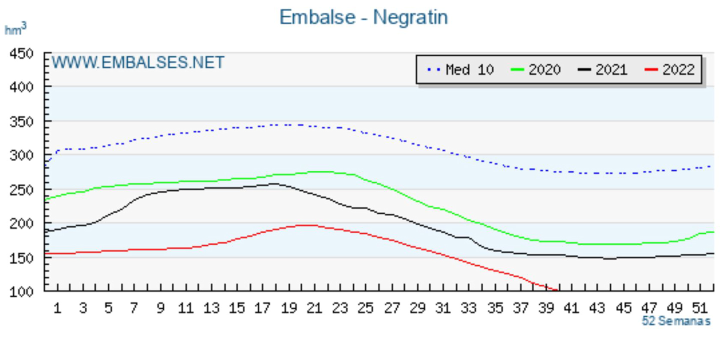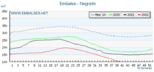 Y para terminar, fijamos nuestra atención en el embalse del Negratín, donde el agua embalsada el pasado martes era 101 hm3 o el 17.69% de los 571 hm3 que podría contener en total, dándose la circunstancia que esta semana no hay pérdida alguna respecto a la anterior, a consecuencia de la lluvia de las dos jornadas en que se dejaron ver precipitaciones en la zona. Si embargo, sí que hay una considerable disminución respecto a la media de igual semana de los últimos diez años, que es de 274 hm3 o el 48.13% de su capacidad total de almacenamiento.