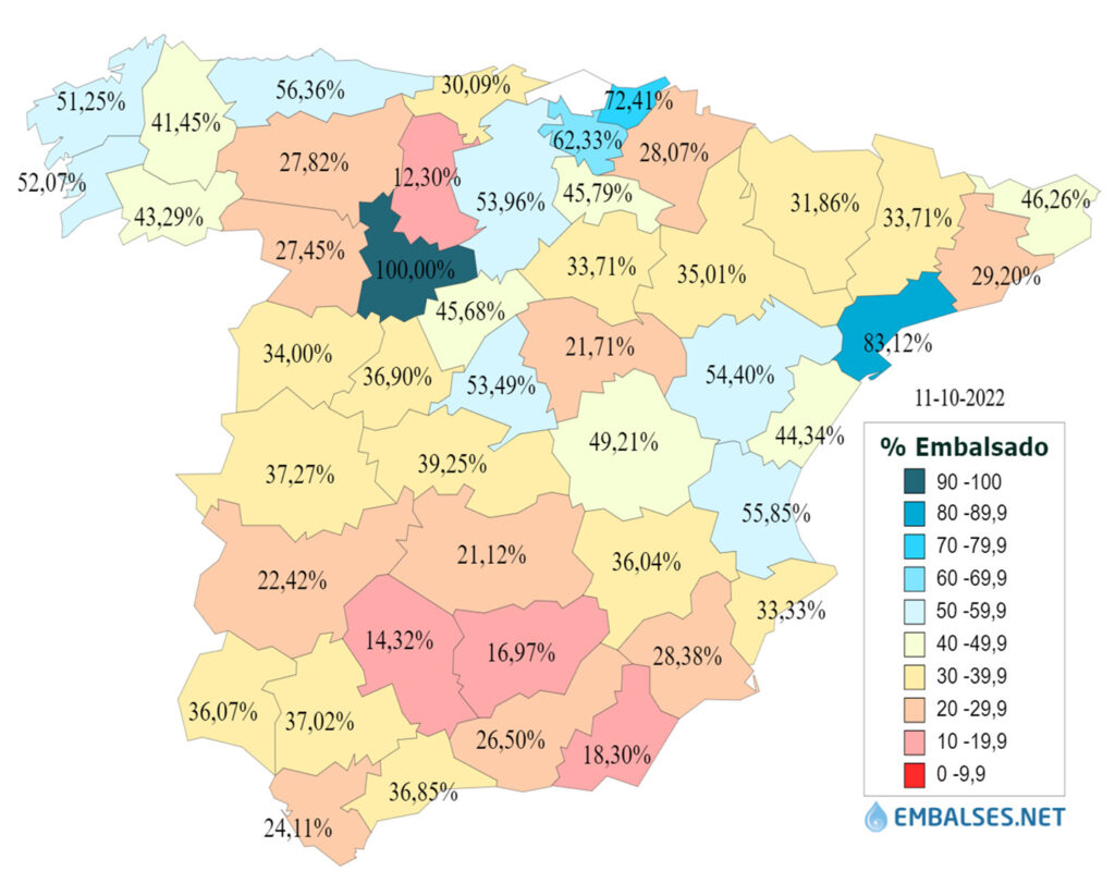 Los embalses almacenan actualmente 17.747 hectómetros cúbicos (hm³) de agua, disminuyendo en la última semana en 197 hectómetros cúbicos (el 0,4 por ciento de la capacidad total actual de los embalses). Muy distante también de las cifras que resultan de la media de los últimos diez años, de esta misma semana, que está en 27.747 hm3, que suponían un 49.49% de la capacidad total.
