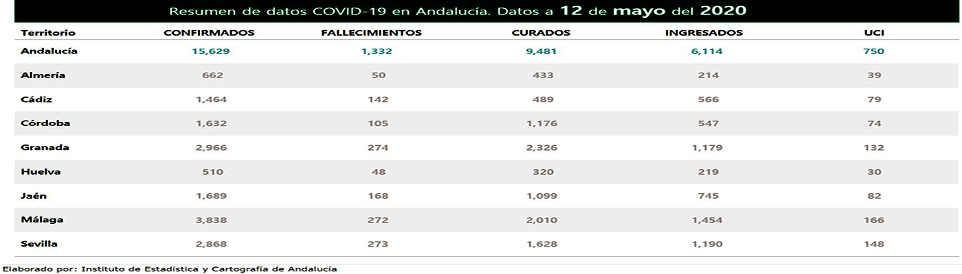 Por su parte, la Consejería de Salud y Familias, en colaboración con el Instituto de Estadística y Cartografía de Andalucía, ofrece sus propias cifras sobre la situación en nuestra Área Sanitaria, referida a todo su conjunto, y correspondiente al 12 de mayo de 2020, fecha en la que se daban a conocer los siguientes datos, en los que figuran entre paréntesis los del día anterior: