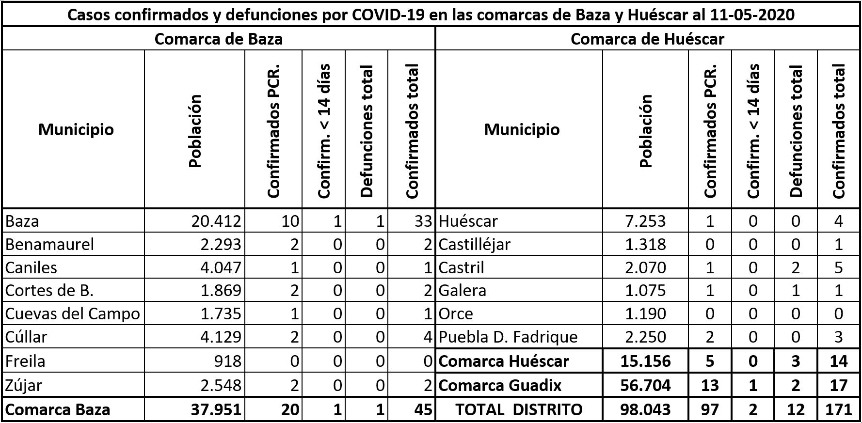 Datos ofrecidos por la Junta de Andalucía para las comarcas de Baza y Huéscar. Datos que corresponden al lunes 11 de mayo, que son los que se pasaron al Ministerio de Sanidad un día antes, y de los que hemos tomado los relativos a las comarcas de Baza y Huéscar, así como el total de nuestra Área Sanitaria, pormenorizado los referidos a los municipios de estas dos comarcas.