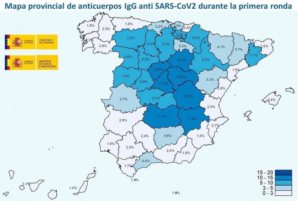 Por comunidades autónomas, existe una marcada variabilidad geográfica y las zonas con mayor prevalencia de anticuerpos es cinco veces mayor que en las zonas donde ha habido una menor presencia del virus en la población. A nivel general y analizando por comunidades autónomas, la prevalencia media de personas con anticuerpos en Andalucía se sitúa en el 2,7 por ciento, en un intervalo de confianza al 95 por ciento que va del 2,2 al 3,2; en Aragón del 4,9 por ciento; en Asturias del 1,8 por ciento; en Baleares del 2,4 por ciento; en Canarias del 1,8 por ciento; en Cantabria del 3,2 por ciento; en Castilla y León del 7,2 por ciento; y en Castilla-La Mancha del 10,8 por ciento.