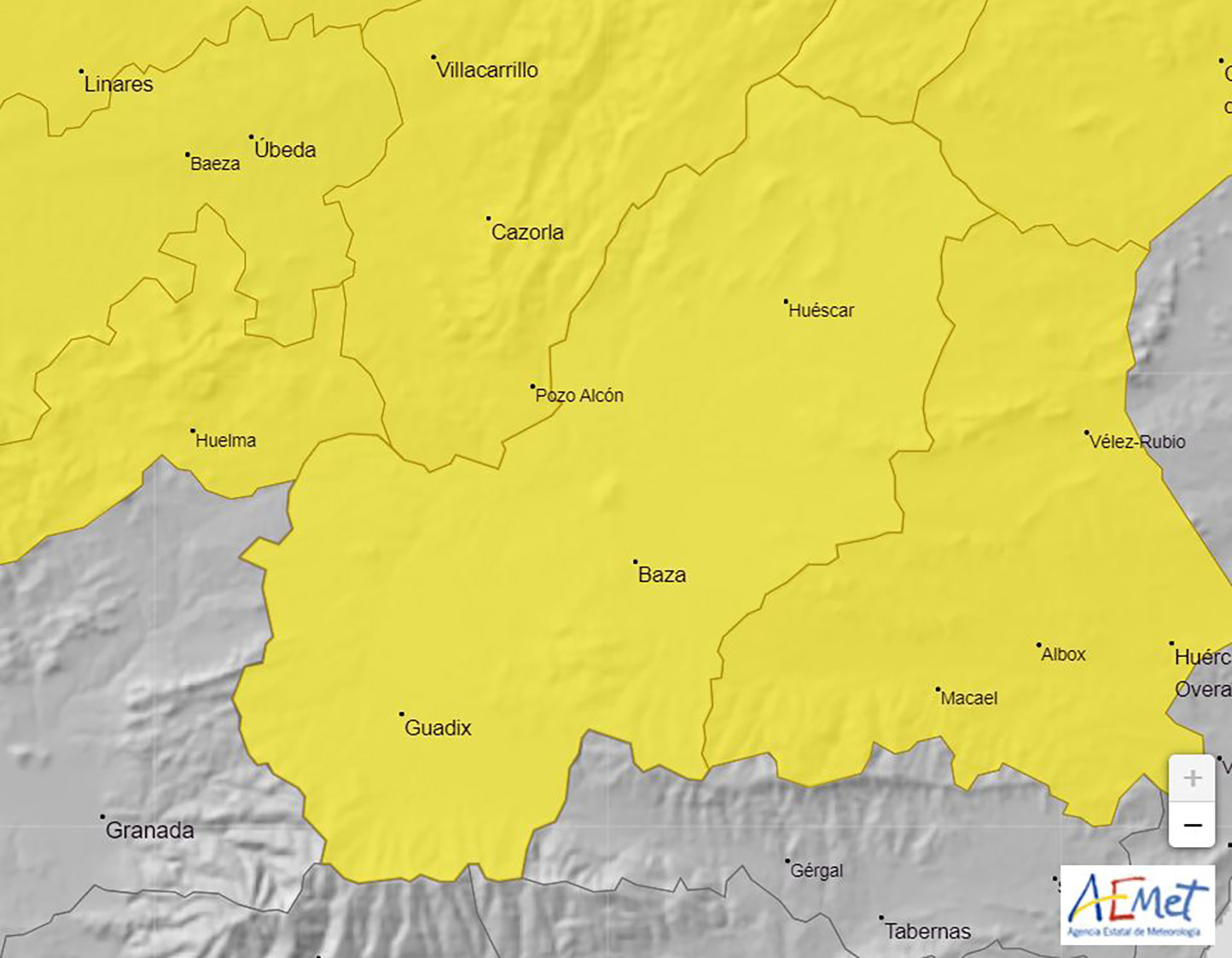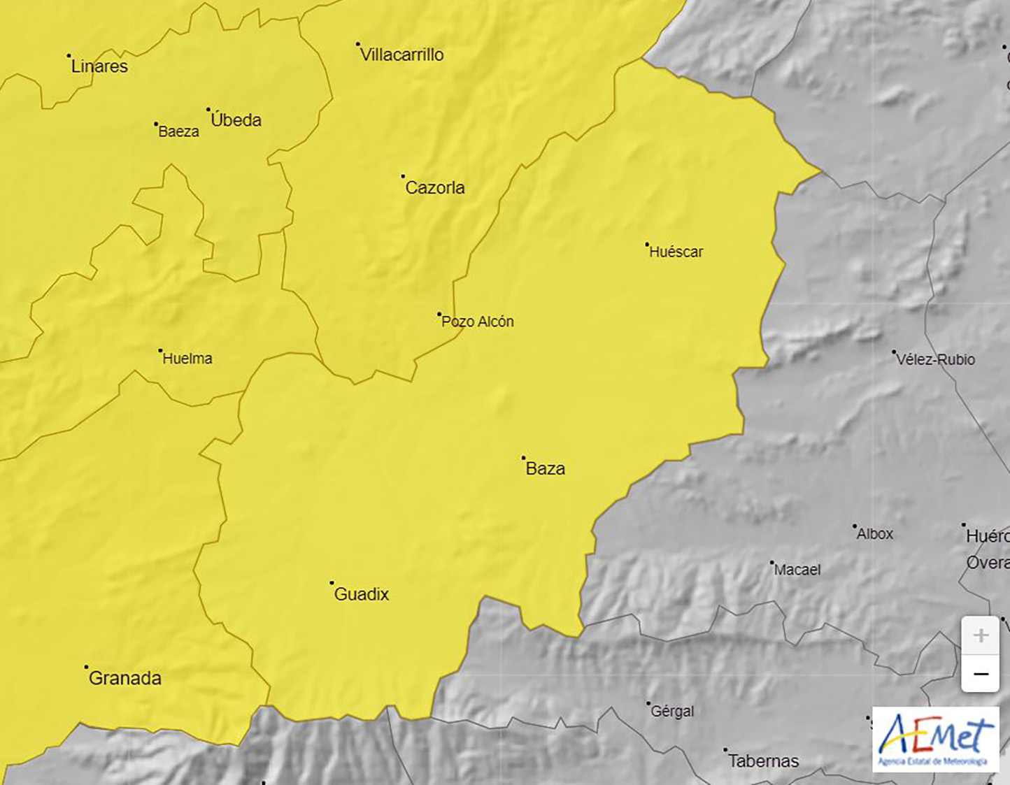 Riesgo que mañana viernes será menor, con una probabilidad de entre el 10%-40%, igualmente para las comarcas del norte granadino y otras próximas de provincias vecinas, con un horario estimado que irá desde las seis de la tarde a las doce de la noche.