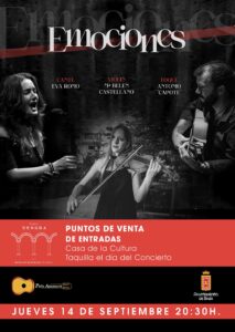 - 20:30 h.: Actuación de flamenco, “Emociones”, con los artistas Antonio Capote, al toque, Eva Romo, al cante y Mª Belén Castellano, al violín. Venta de entradas en Casa de la Cultura y en la taquilla del teatro el día de la actuación.